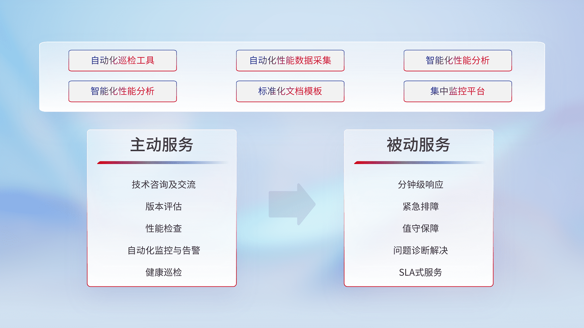 智能化工具和标准化文档,,,,保障服务质量,,,,提供主动服务(包含技术咨询、、版本评估、、性能检查、、、、自动化监控与告警、、、、健康巡检)和被动服务包含(分钟级响应、、、紧急排障、、值守保障、、问题诊断解决、、、SLA服务)。。